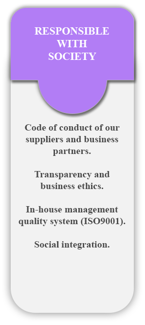 We maintain a strict code of conduct for our suppliers and business partners, ensuring ethical and transparent practices in all our commercial relationships. We operate under the principles of transparency and business ethics in every aspect of our activities. We have an internal quality management system certified according to ISO9001 standards, ensuring excellence in our processes and services. Additionally, we promote social integration by supporting initiatives that contribute to the well-being of the community.